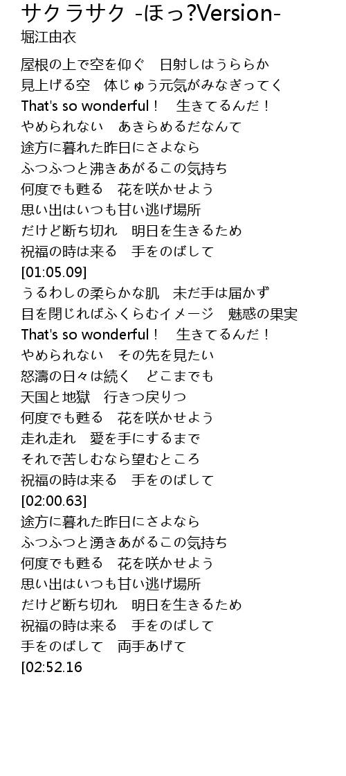 | [00:18.43] | 屋根の上で空を仰ぐ 日射しはうららか |