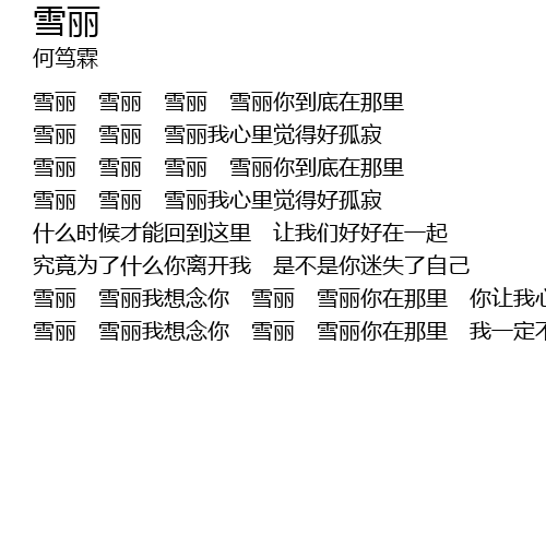 | 雪丽 雪丽我想念你 雪丽 雪丽你在那里 你让我心里好着急 | |