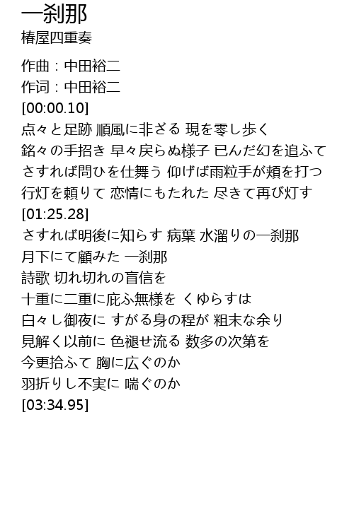 | [02:02.41] | さすれば明後に知らす 病葉 水溜りの一刹那 |