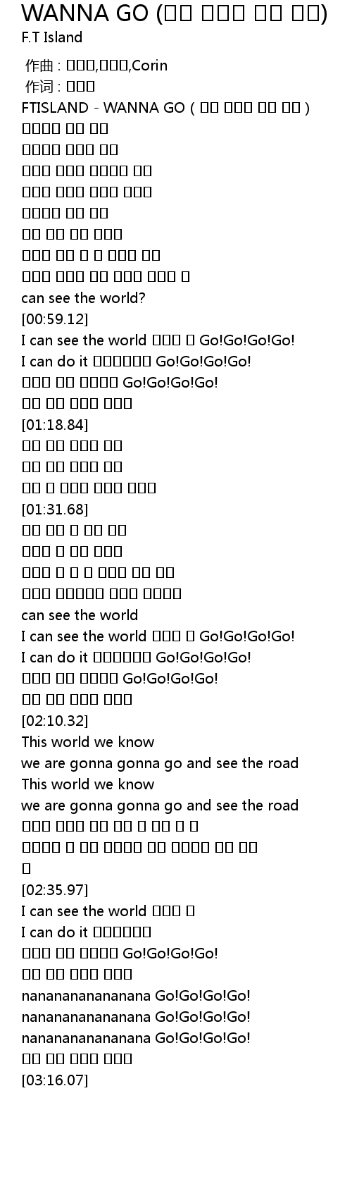 | [00:00.96] | FTISLAND - WANNA GO(세상 끝나지 않는 노래) |