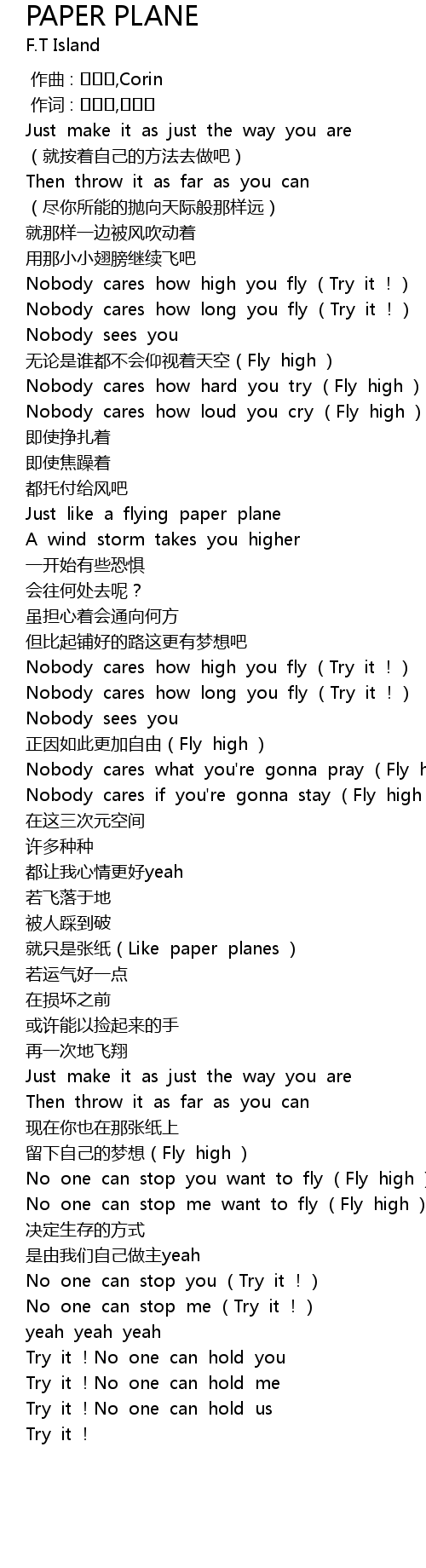 | [02:30.74] | jiù zhǐ shì zhāng zhǐ Like paper planes |