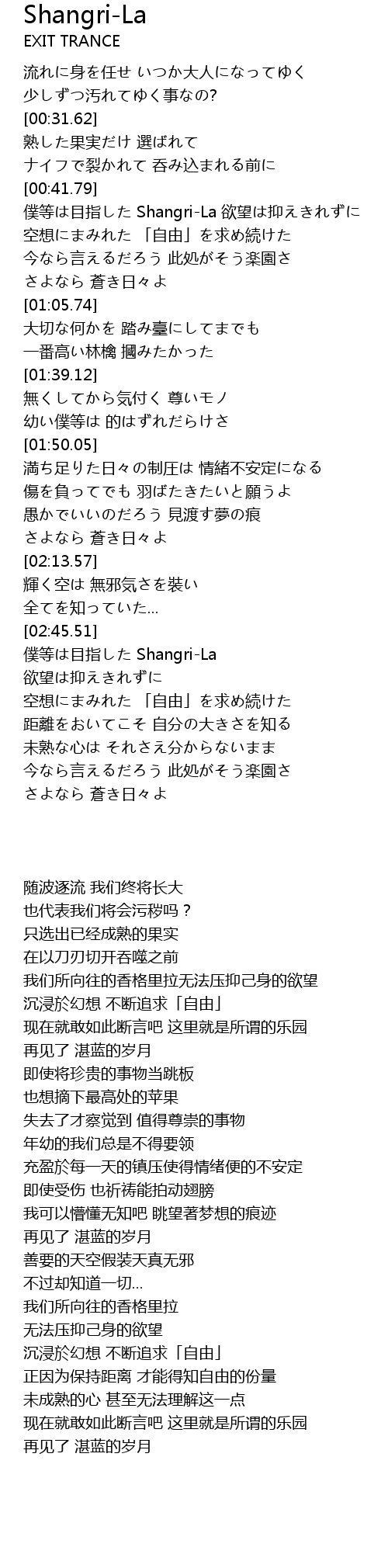 | [00:44.26] | 僕等は目指した Shangri-La 欲望は抑えきれずに |