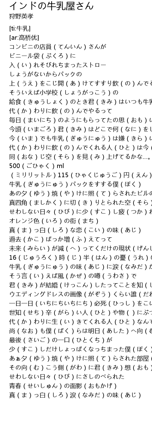 | [03:52.174] | 少(すこ)しだけしょっぱくなっちまった僕(ぼく)の牛乳(ぎゅうにゅう) |