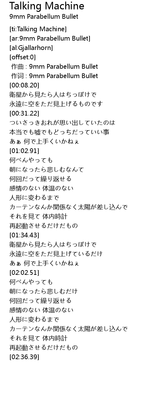 | [00:01.00] | 作词 : 9mm Parabellum Bullet |