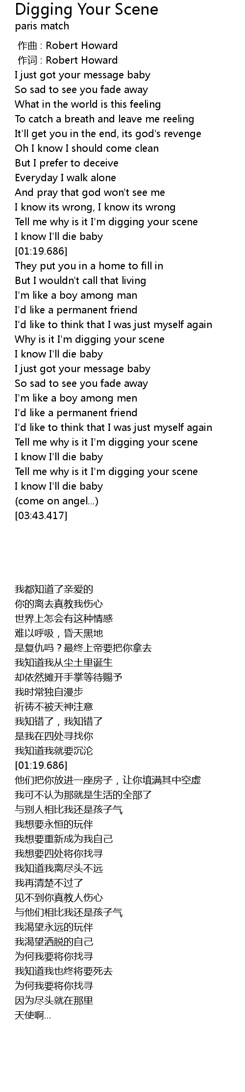 | [03:11.455] | Tell me why is it I' m digging your scene |