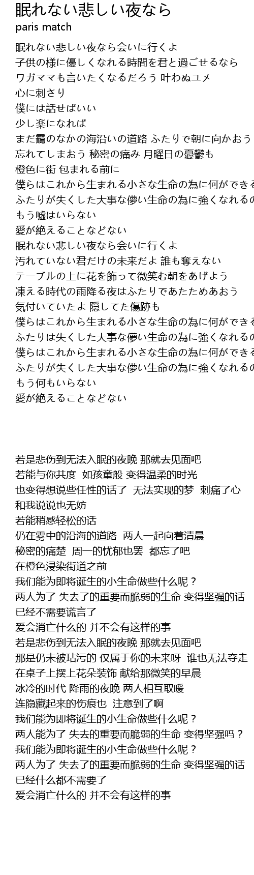 | [00:02.00] | 眠れない悲しい夜なら会いに行くよ |