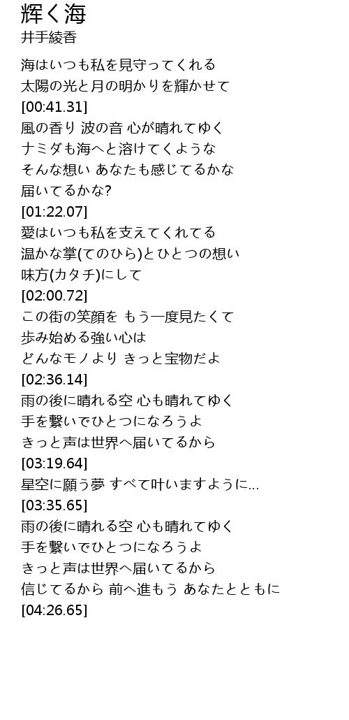 | [00:43.53] | 風の香り 波の音 心が晴れてゆく |