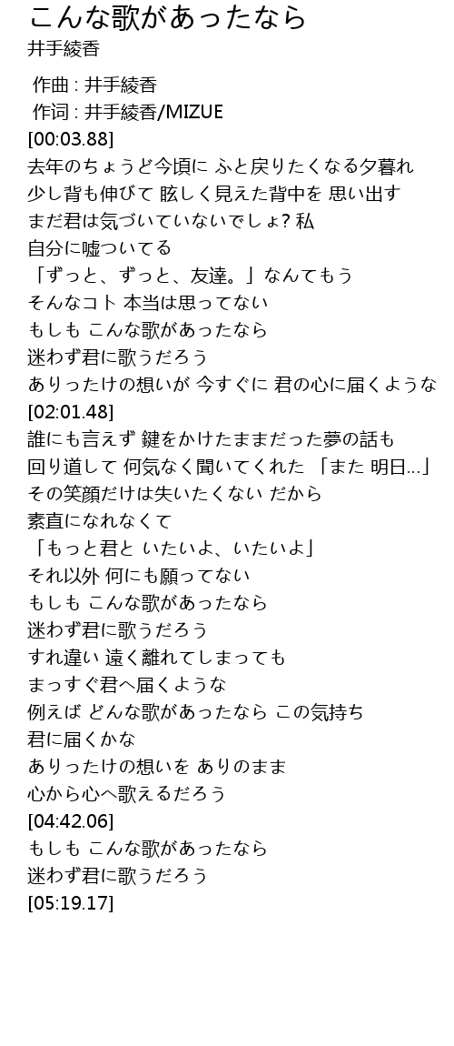 | [04:50.89] | もしも こんな歌があったなら 迷わず君に歌うだろう |