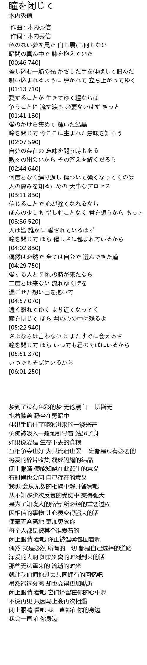| [05:39.920] | 瞳を閉じて ほら いつでも君のそばにいるから |