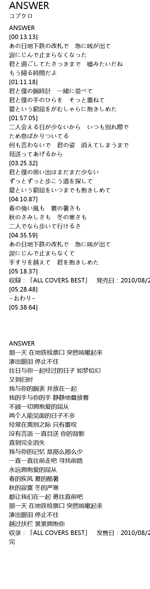 | [05:24.13] | 収録:「ALL COVERS BEST」 発売日:2010/08/25 |