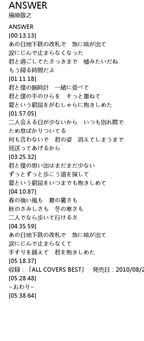 | [05:24.13] | 収録:「ALL COVERS BEST」 発売日:2010/08/25 |