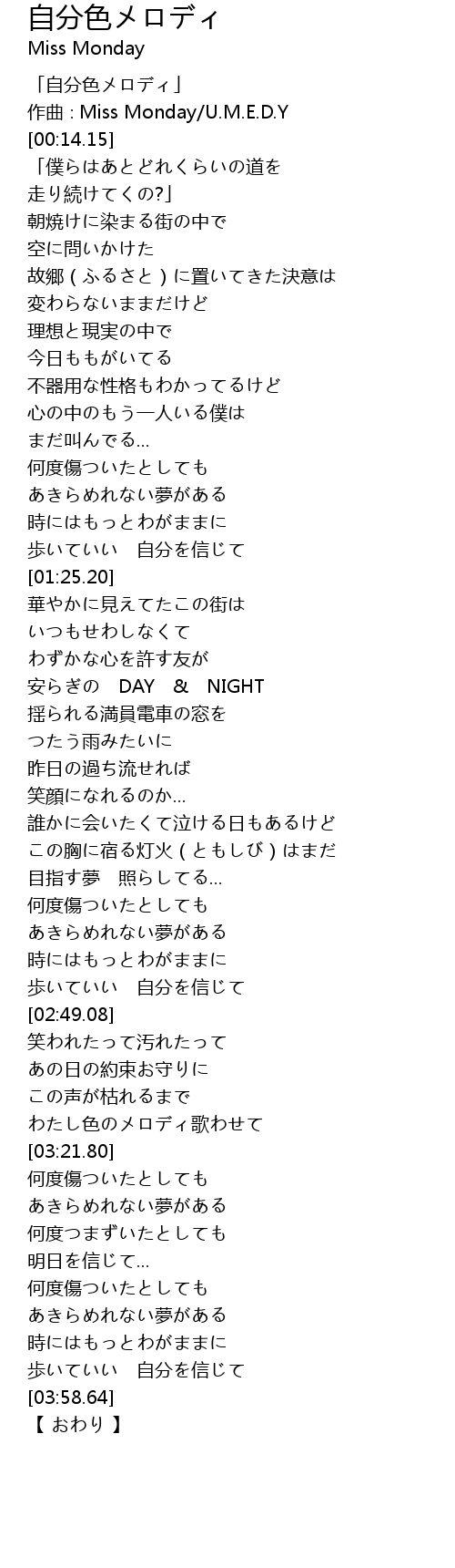 | [00:01.15] | 「自分色メロディ」 |