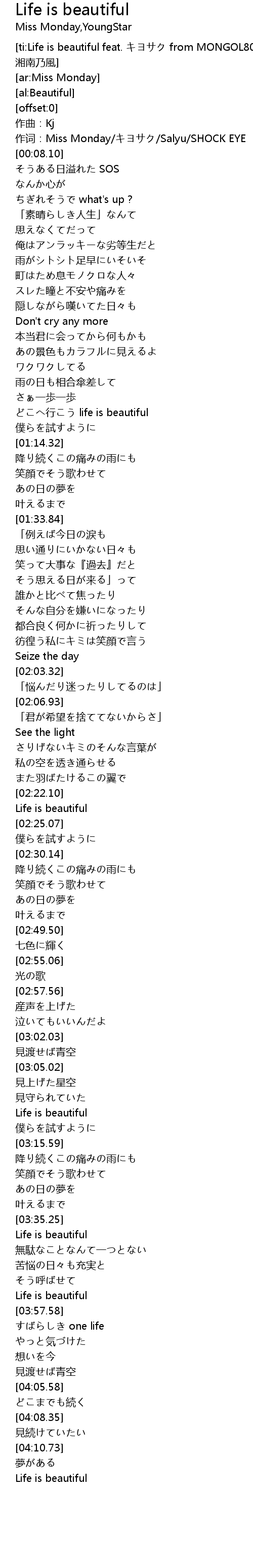 | [ti:Life is beautiful feat. キヨサク from MONGOL800, Salyu, SHOCK EYE from 湘南乃風] | |