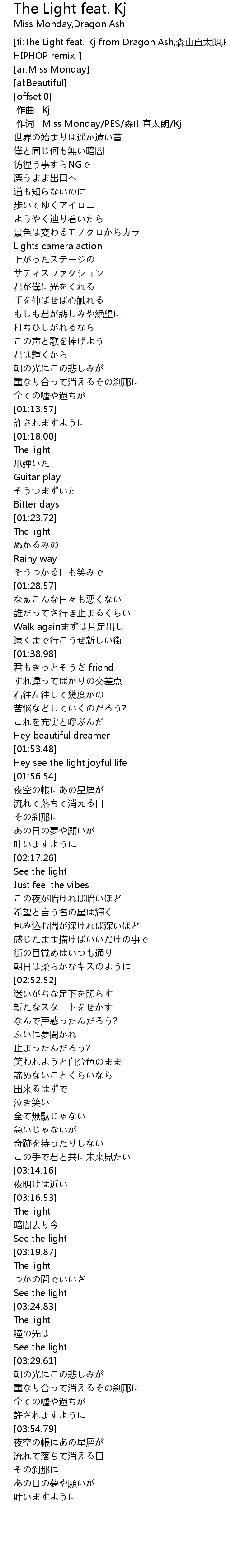| [ti:The Light feat. Kj from Dragon Ash,森山直太朗,PES from RIP SLYME -90's HIPHOP remix-] | |