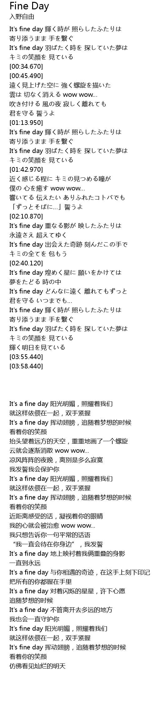 | [03:21.540] | It's fine day 輝く時が 照らしたふたりは |