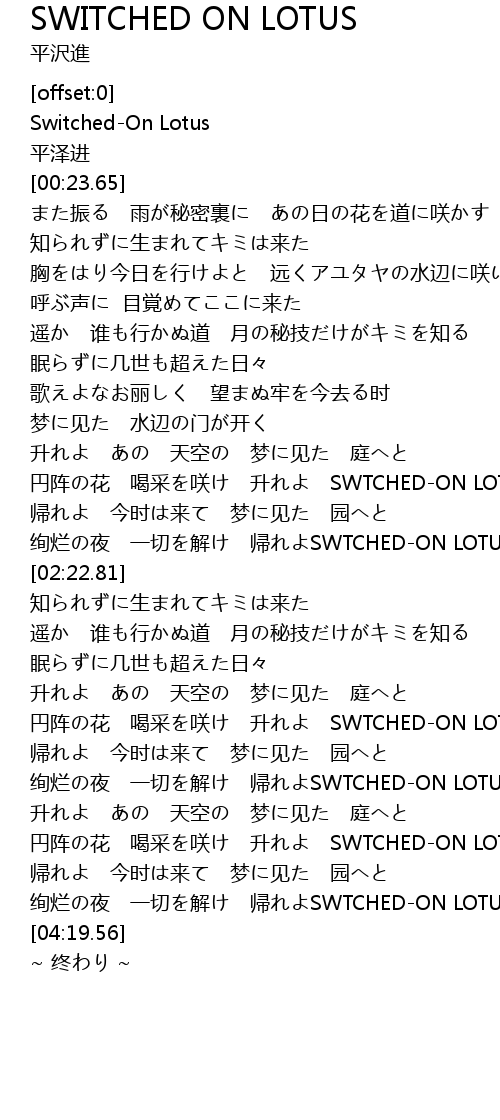 | [04:10.89] | 绚烂の夜 一切を解け 帰れよSWTCHED-ON LOTUS |