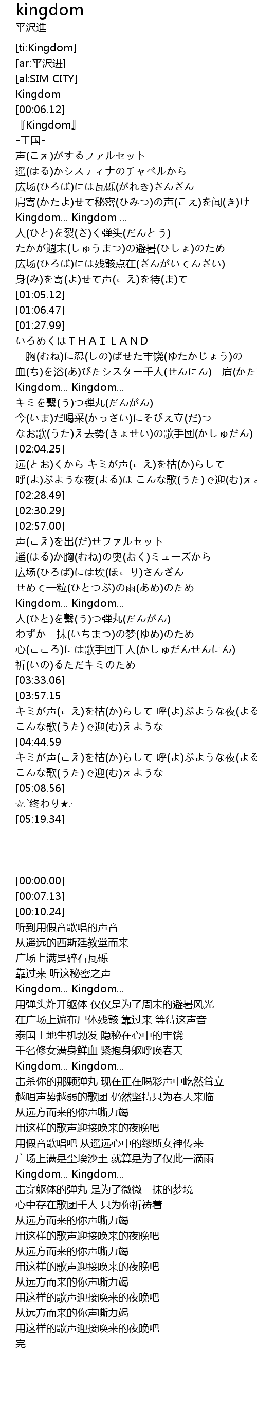 | [00:59.23] | 広场(ひろば)には残骸点在(ざんがいてんざい) 身(み)を寄(よ)せて声(こえ)を待(ま)て |