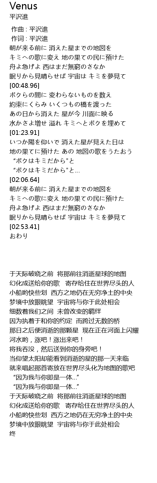 | [00:43.46] | 眠りから見晴らせば 宇宙は キミを夢見て |