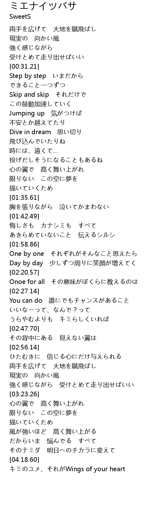 | [04:20.54] | キミのユメ、それがWings of your heart |