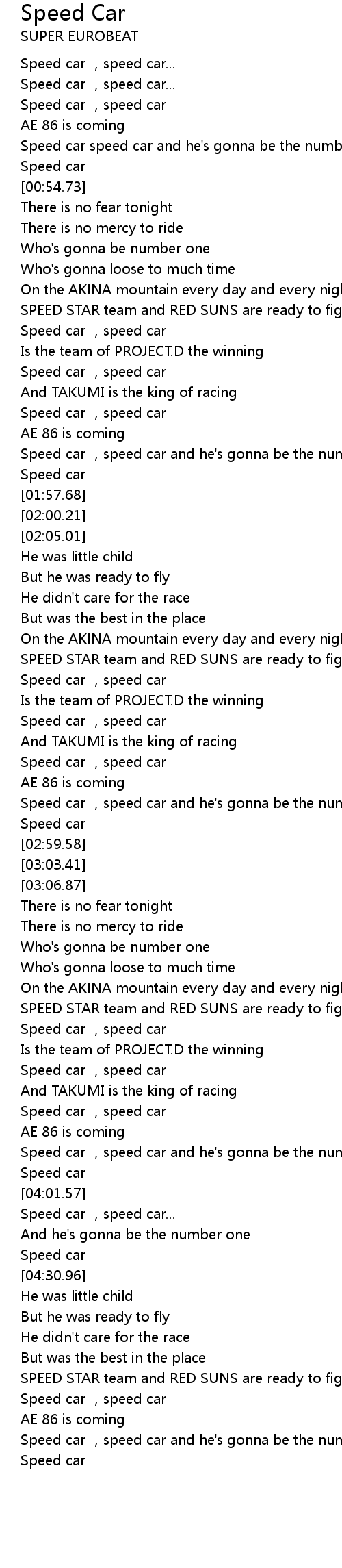 | [00:46.27] | Speed car speed car and he' s gonna be the number one |