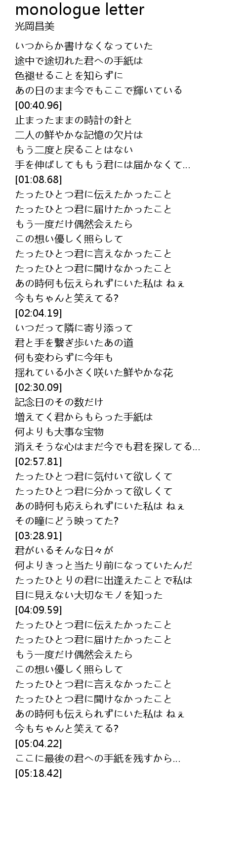 | [04:18.13] | たったひとつ君に届けたかったこと |
