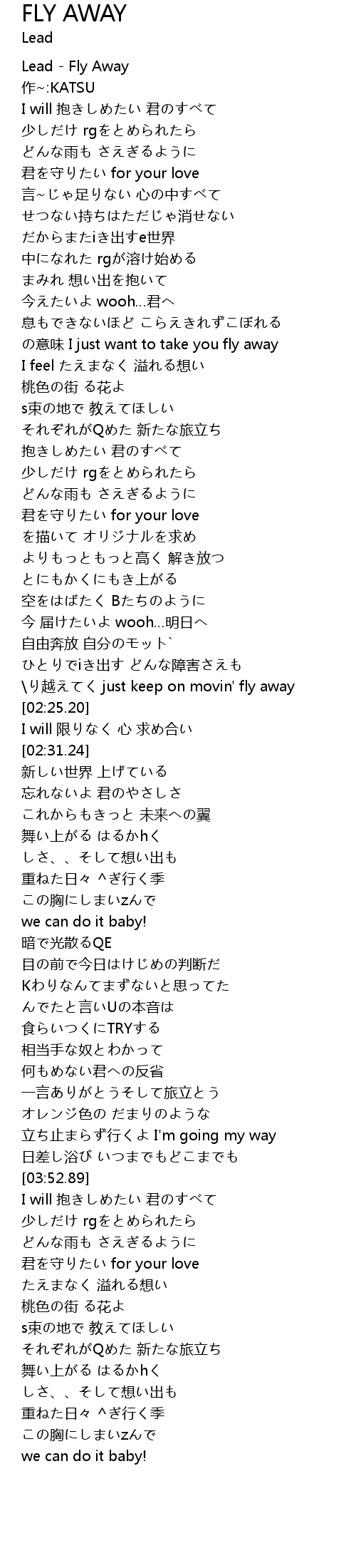 | [02:23.13] | \り越えてく just keep on movin' fly away |