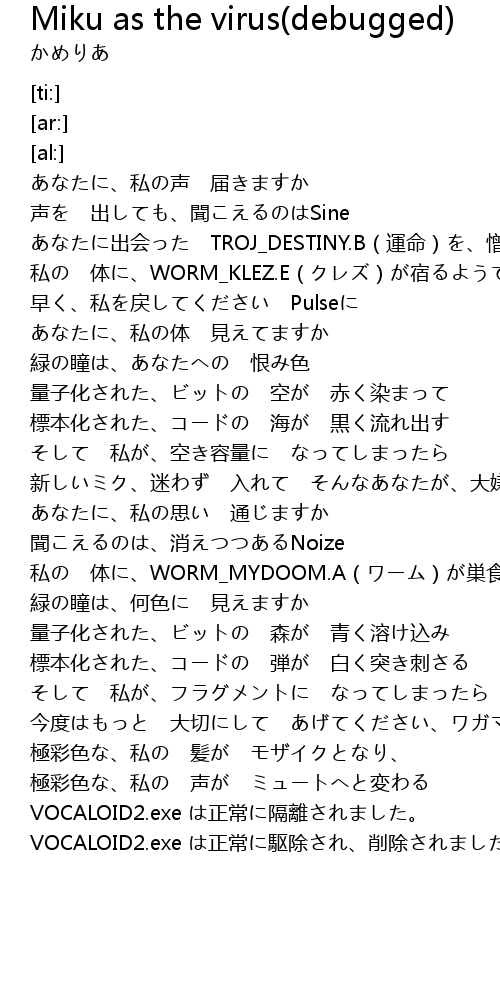 | [03:21.96] | 私の 体に、WORM_MYDOOM.A(ワーム)が巣食うようで |
