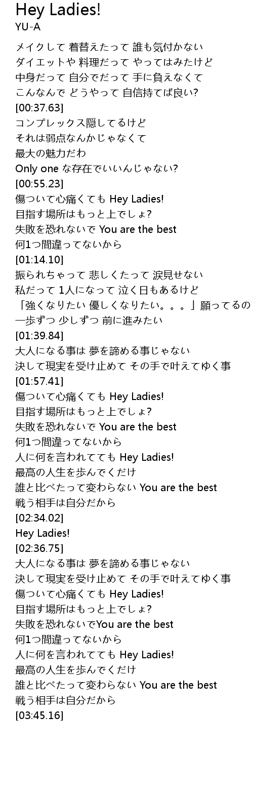 | [00:55.61] | 傷ついて心痛くても Hey Ladies! |
