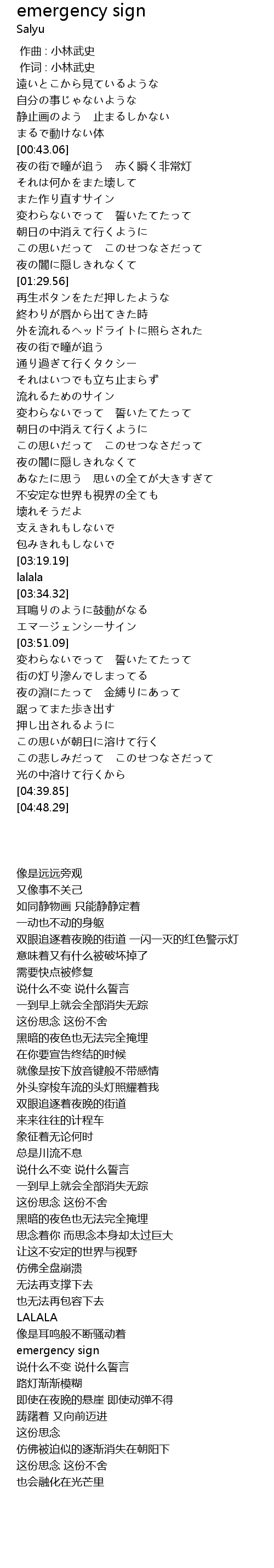 | [00:44.21] | 夜の街で瞳が追う 赤く瞬く非常灯 |
