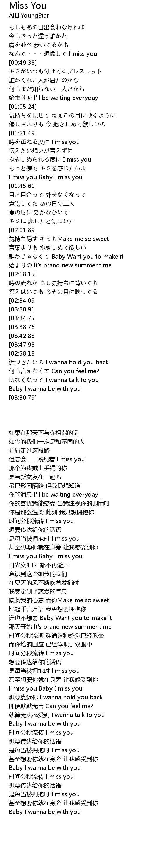 | [03:55.14][03:30.91][02:34.37] | shi zhong du I miss you |