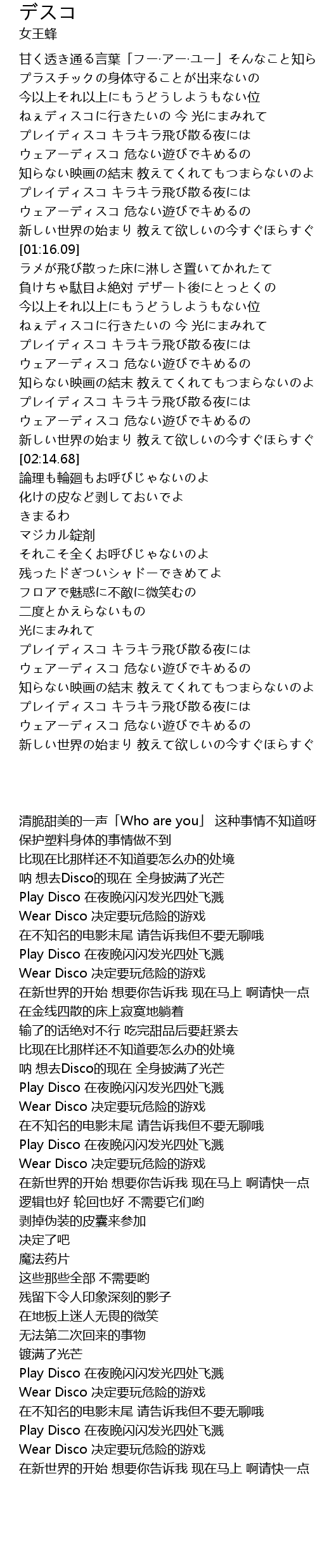 | [02:03.78] | ウェアーディスコ 危ない遊びでキめるの |