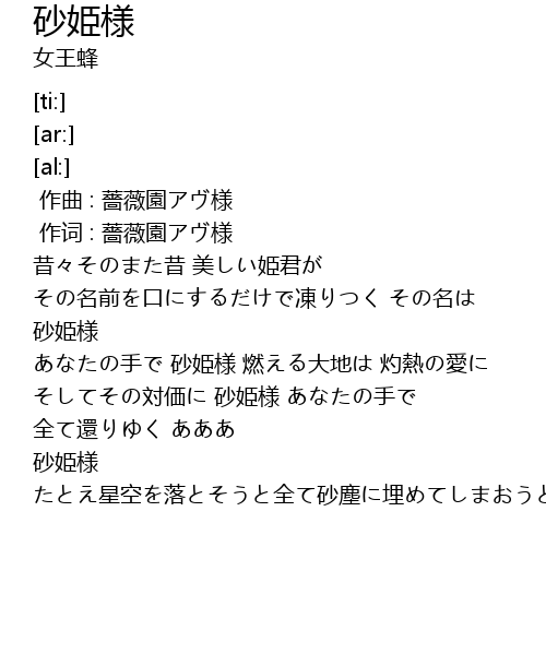 | [01:38.37] | そしてその対価に 砂姫様 あなたの手で 全て還りゆく あああ |