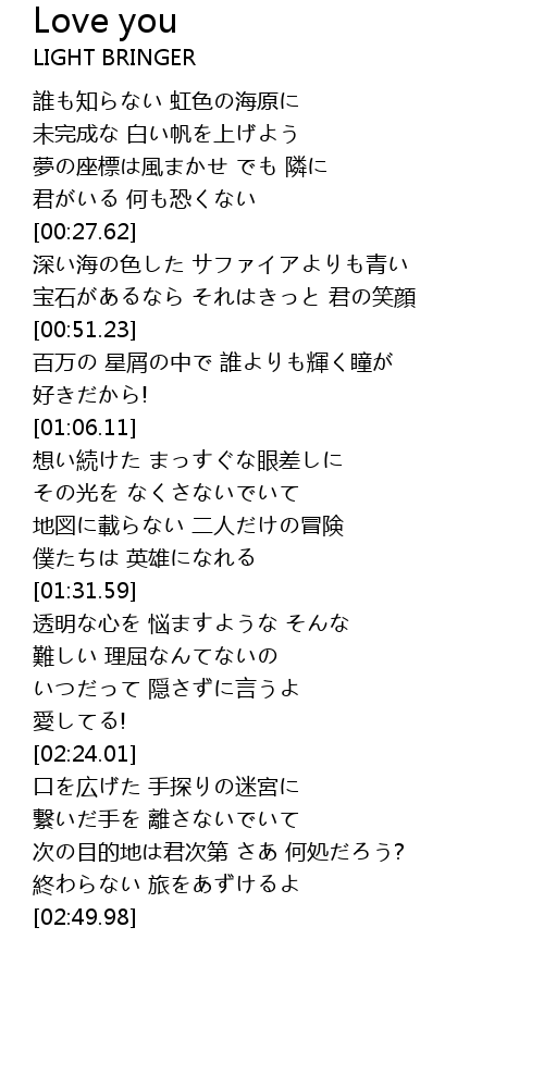| [02:15.52] | いつだって 隠さずに言うよ |