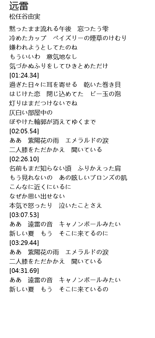 | [04:12.99] | ああ 紫陽花の雨 エメラルドの涙 |