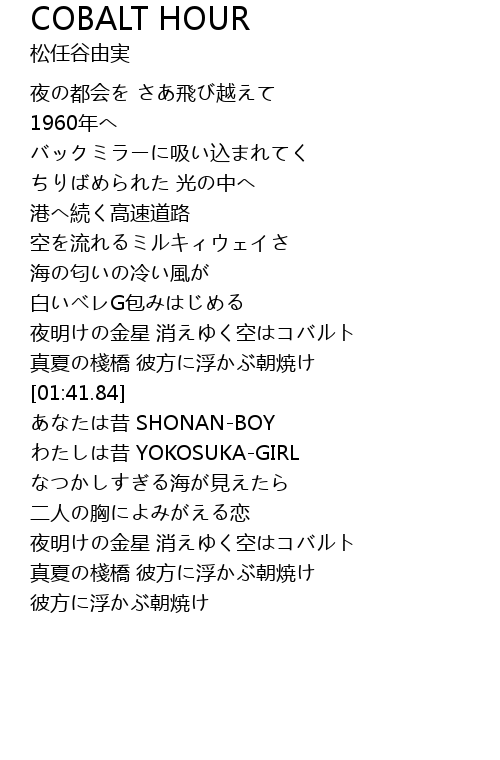 | [00:59.93] | 夜明けの金星 消えゆく空はコバルト |