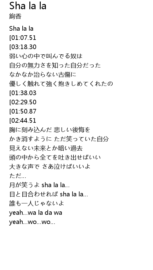 | [00:09.00][01:07.51][03:06.67] | 絢香-Sha la la |