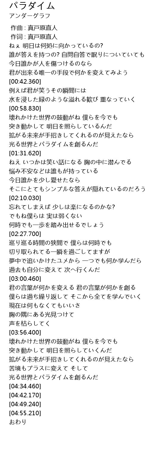 | [04:26.770] | 光る世界とパラダイムを創るんだ |
