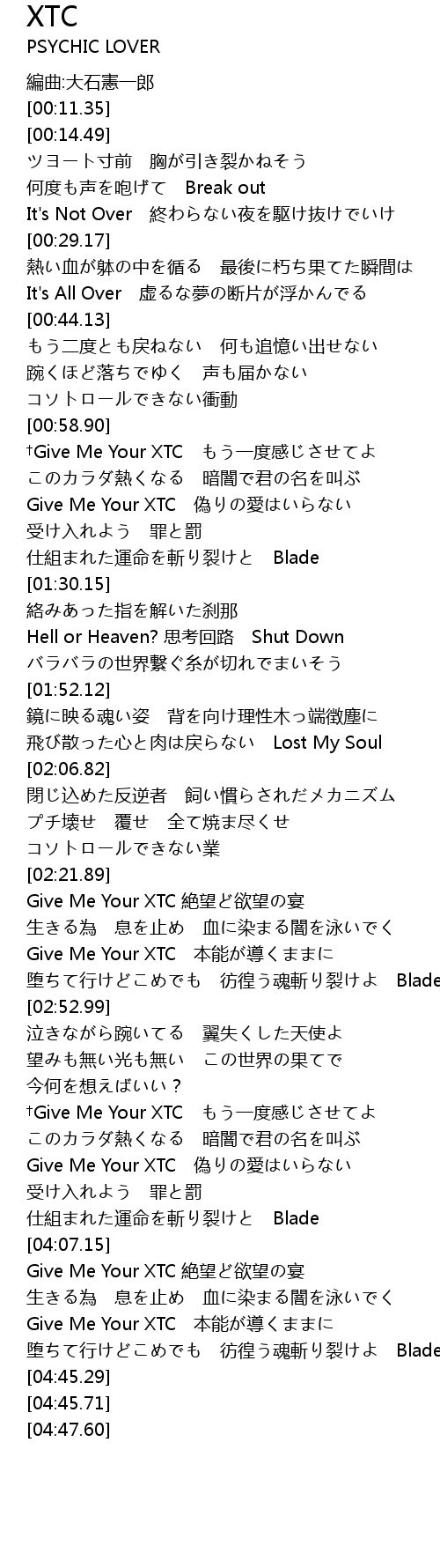 | [02:22.11] | Give Me Your XTC 絶望ど欲望の宴 |
