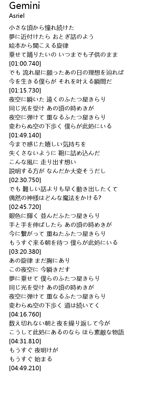 | [01:15.860] | 夜空に瞬いた 遠くのふたつ星きらり |