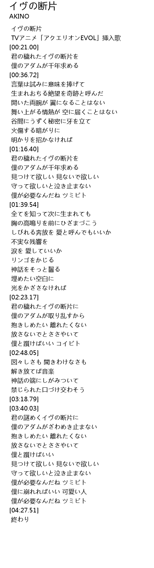 | [02:23.83] | 君の穢れたイヴの断片に |