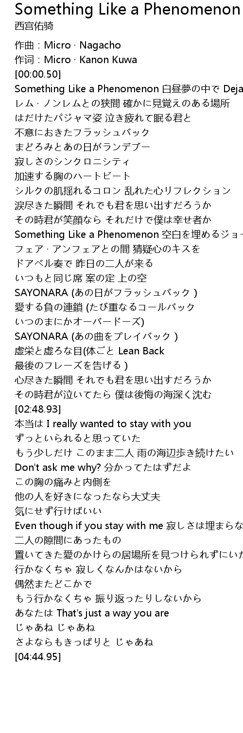 | [00:18.72] | Something Like a Phenomenon 白昼夢の中で Dejavu |