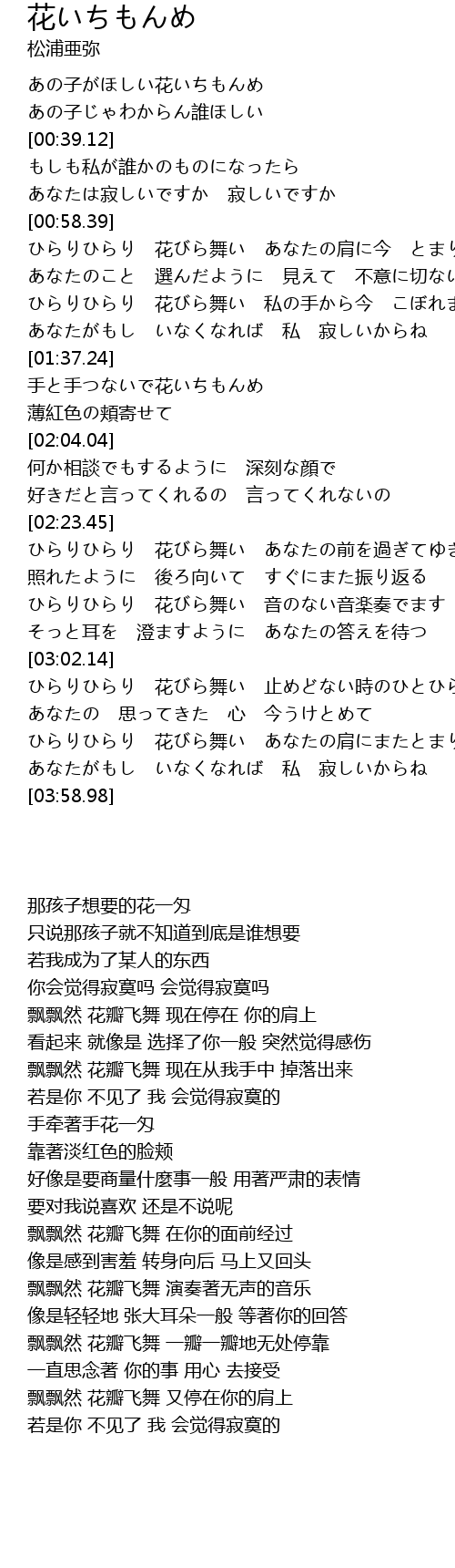 | [02:24.48] | ひらりひらり 花びら舞い あなたの前を過ぎてゆきます |