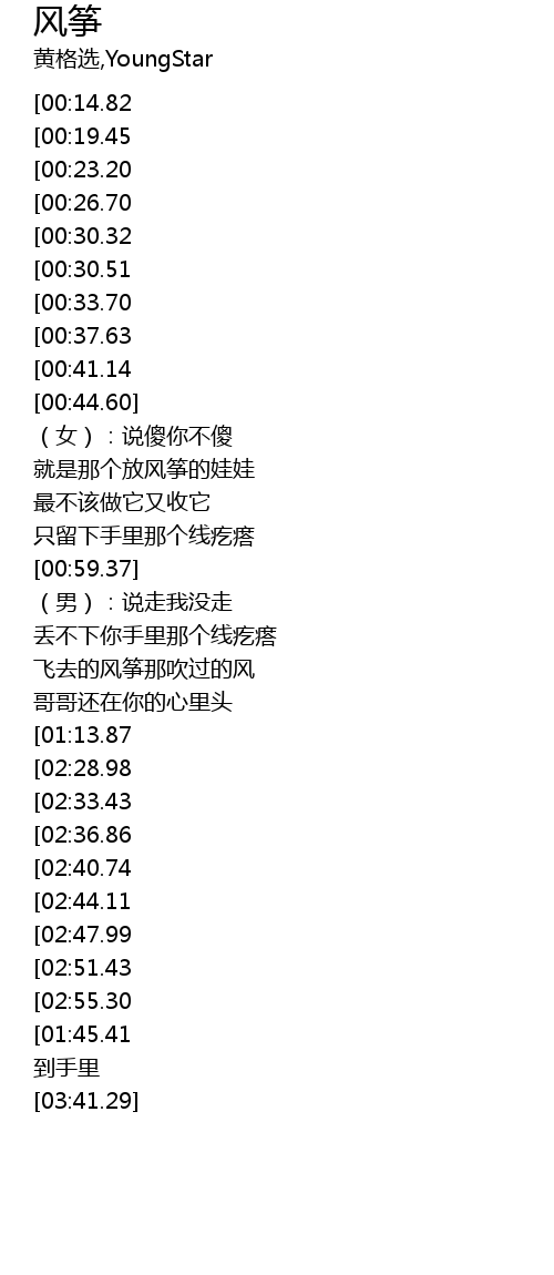 | [02:59.14][02:28.98][01:14.06] | he: feng zheng fei ya feng zheng fei ya |