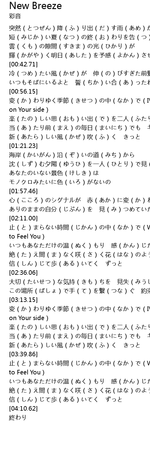 | [00:56.56] | 変(か)わりゆく季節(きせつ)の中(なか)で(I\'m on Your side) |