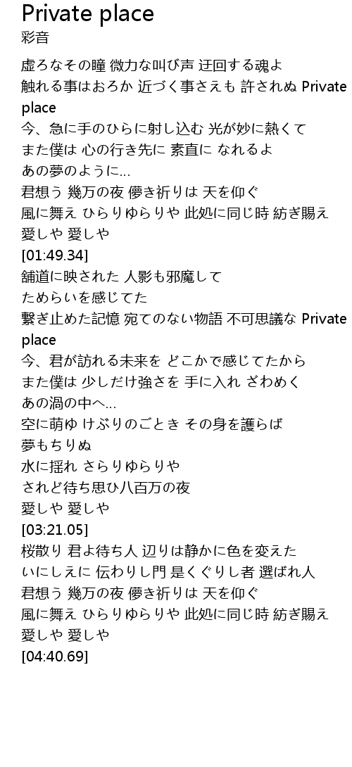 | [00:39.90] | 触れる事はおろか 近づく事さえも 許されぬ Private place |