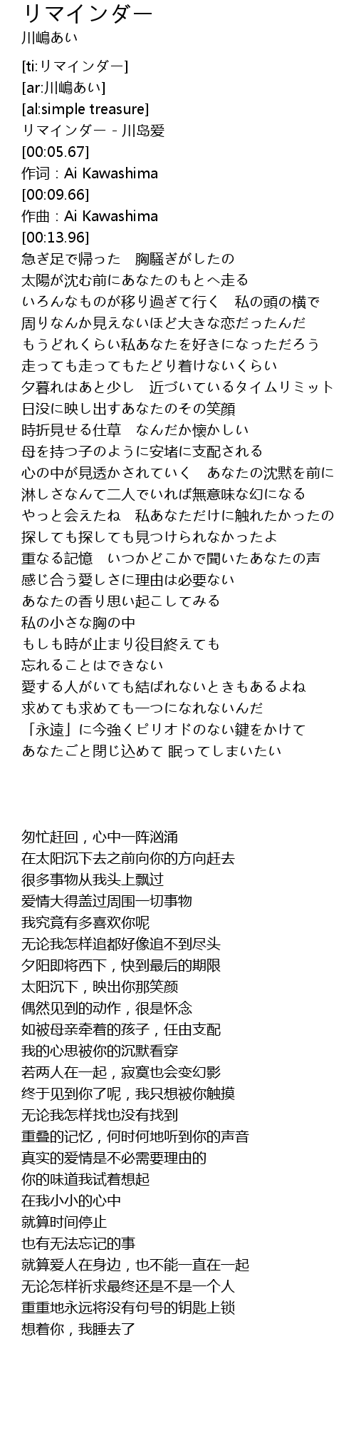 | [00:03.21] | リマインダー - 川岛爱 |