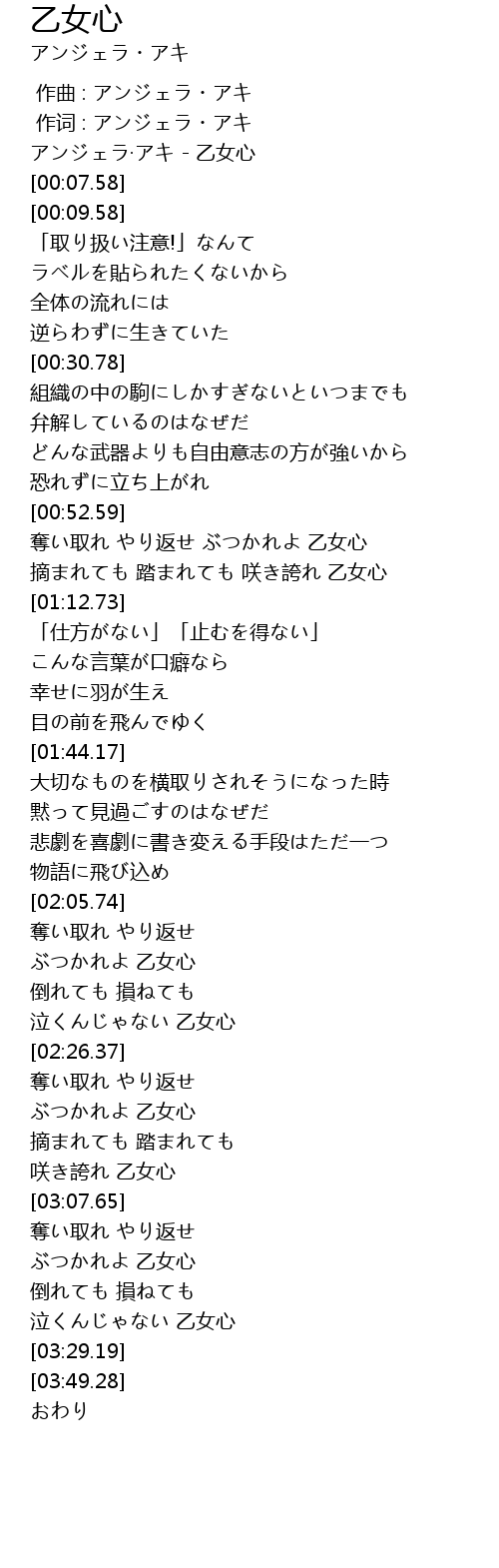 | [00:00.00] | アンジェラ·アキ - 乙女心 |