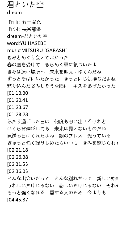 | [04:17.72][02:36.05] | 変わらぬ想い きみの胸に届けたいよ |