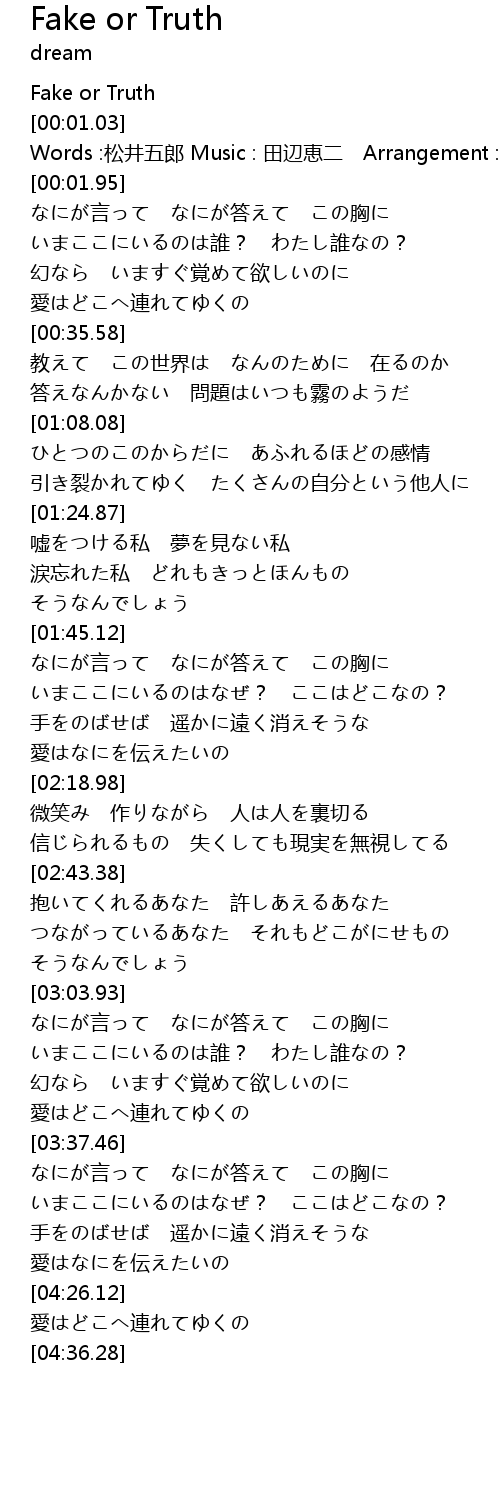 | [01:33.49] | 涙忘れた私 どれもきっとほんもの |