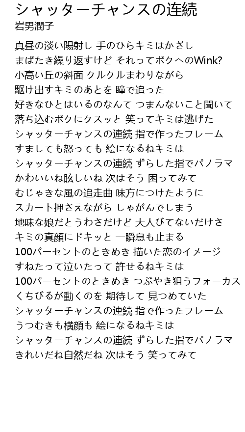 | [01:11.83] | シャッターチャンスの連続 指で作ったフレーム |